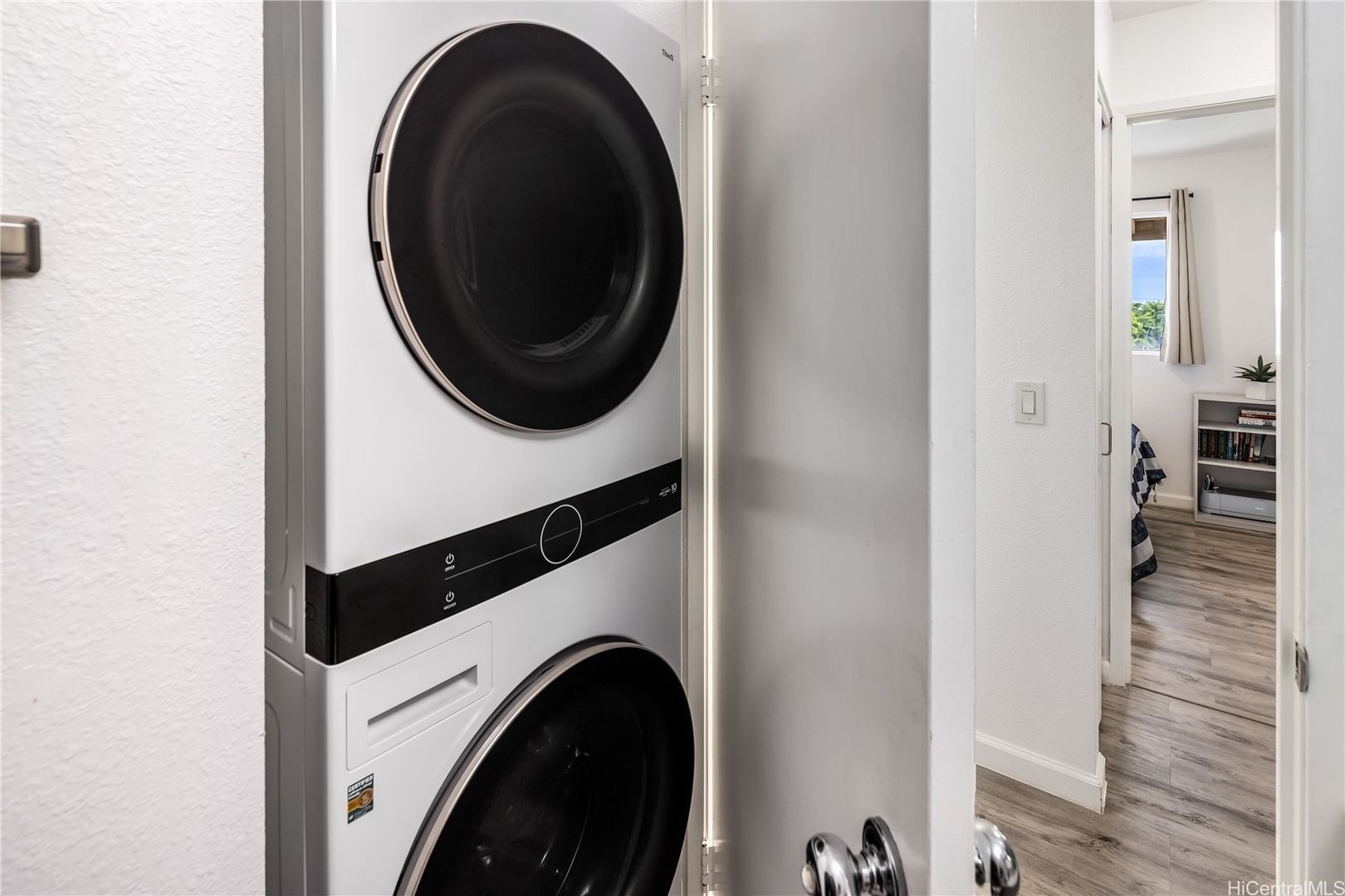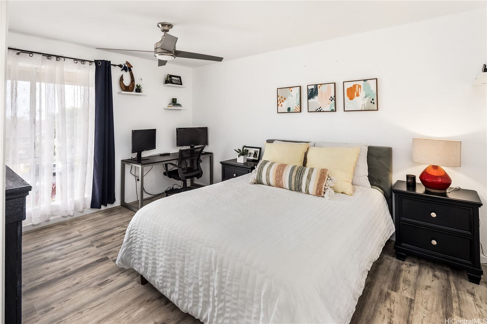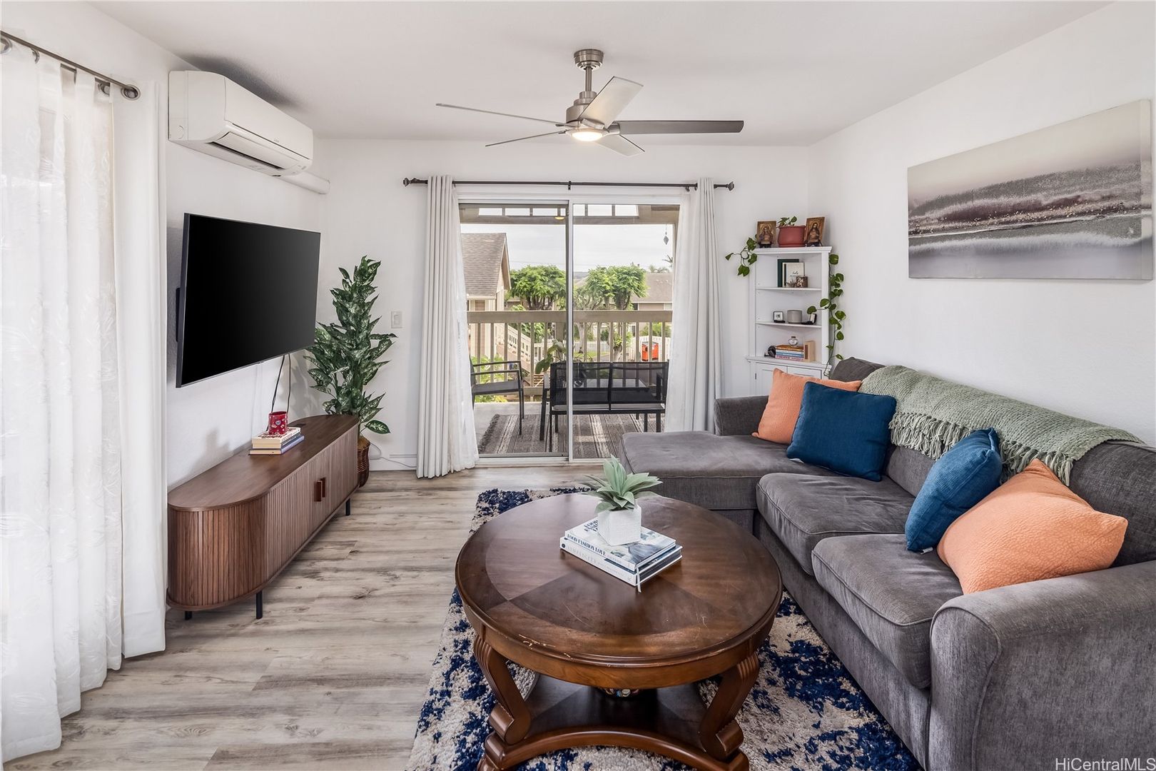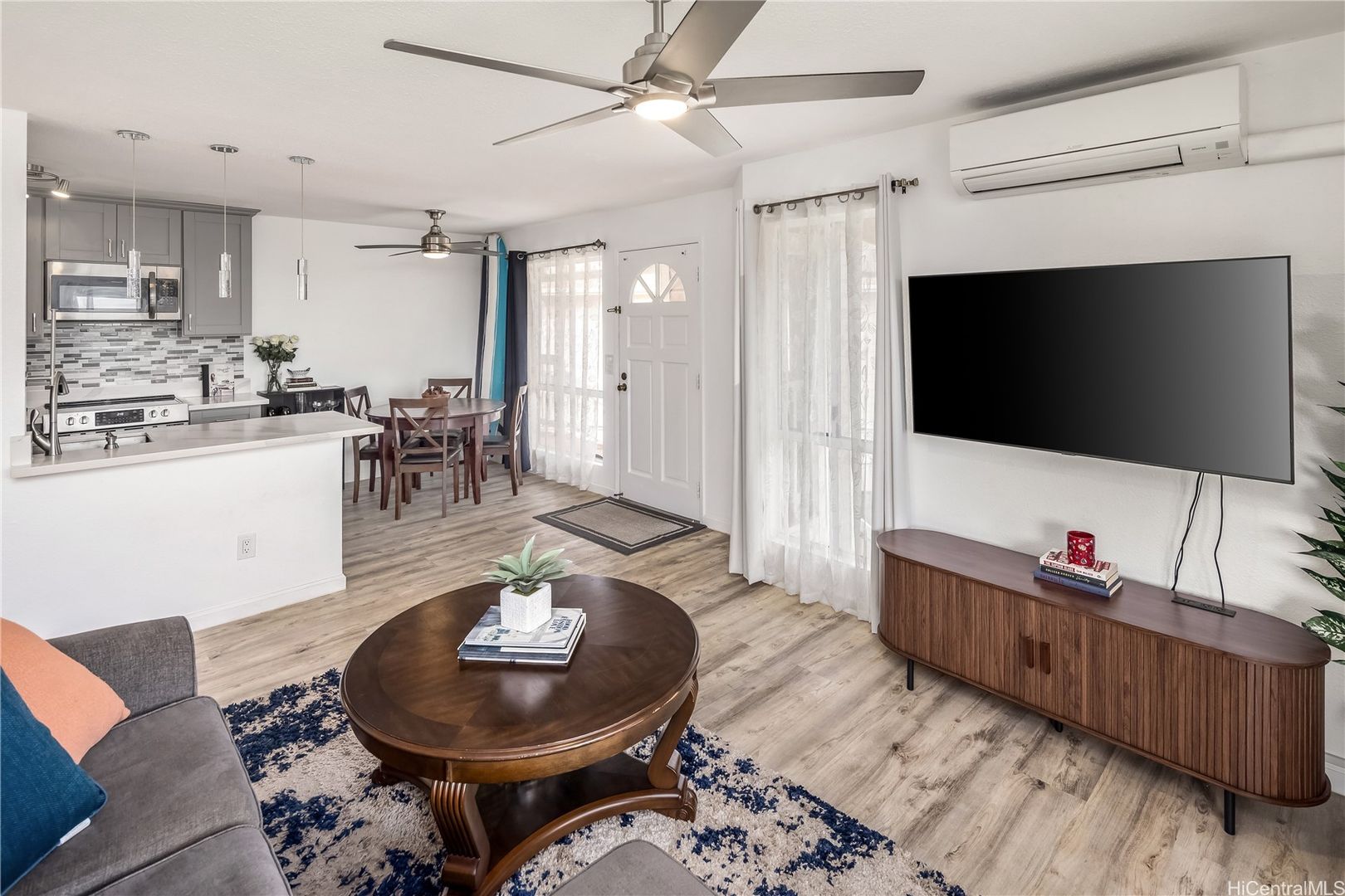 Enjoy conveniences such as a dishwasher, full-sized in-unit washer and dryer, and updated flooring throughout. The living room has a split AC unit and ceiling fan for added comfort, with additional ceiling fans in both bedrooms.
